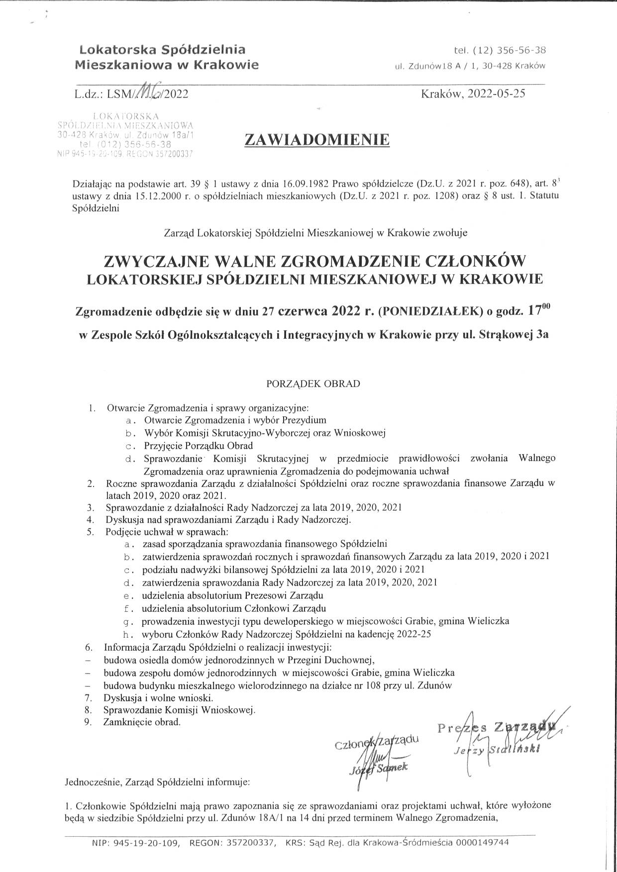 WALNE ZGROMADZENIE ZGROMADZENIE CZŁONKÓW LOKATORSKIEJ SPÓŁDZIELNI MIESZKANIOWEJ 25.06.2025